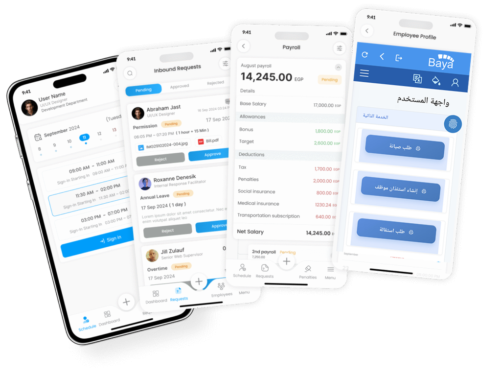 يمكن تسجيل الحضور/الانصراف باستخدام تقنية التعرف على الوجه ونظام GPS عبر الهاتف.
